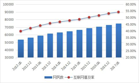 根據(jù)CNNIC最新數(shù)據(jù)顯示,截止2017年6月,我國網(wǎng)民規(guī)模達到7.51億,半年共計新增網(wǎng)民1992萬人?;ヂ?lián)網(wǎng)普及率為54.3%,較2016年底提升1.1個百分點。我國網(wǎng)民規(guī)模增長趨于穩(wěn)定,互聯(lián)網(wǎng)行業(yè)持續(xù)穩(wěn)健發(fā)展,以互聯(lián)網(wǎng)為代表的數(shù)字技術(shù)正在加速與經(jīng)濟社會各領域深度融合,成為促進我國消費升級、經(jīng)濟社會轉(zhuǎn)型、構(gòu)建國家競爭新優(yōu)勢的重要推動力。