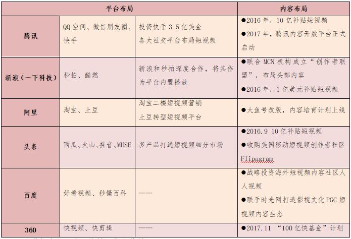 以BAT為首的機構(gòu)重金加速布局短視頻平臺。今日頭條、騰訊、秒拍等均投入10億元扶持短視頻內(nèi)容創(chuàng)業(yè)者。阿里投入20億元進軍短視頻領域,將土豆網(wǎng)打造為專門的短視頻平臺。騰訊專門成立短視頻中心,負責短視頻平臺運行;愛奇藝短視頻平臺的愛奇藝頭條正在內(nèi)測;秒拍成為新浪微博獨家短視頻應用,從工具型短視頻機構(gòu)轉(zhuǎn)型為社交分享類短視頻平臺;華人文化基金領投的資訊類短視頻平臺梨視頻也已形成業(yè)內(nèi)影響力;咪咕視訊作為中國移動在視頻領域的唯一版權(quán)運營實體,也布局短視頻,與中央電視臺共建業(yè)內(nèi)領先的短視頻創(chuàng)作者聚集平臺,打造頭部賬號體系,孵化自有明星短視頻賬號,引入知名工作室直接簽約,盤整已有的強IP資源賬號化運作。