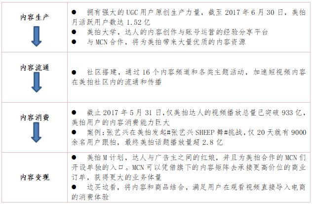 美拍依托美圖公司的“泛女性化”產(chǎn)品布局,搭建完整的自有短視頻平臺生態(tài)閉環(huán),業(yè)務涉及內(nèi)容生產(chǎn)、內(nèi)容流通、內(nèi)容消費和內(nèi)容變現(xiàn)整個產(chǎn)業(yè)鏈條。