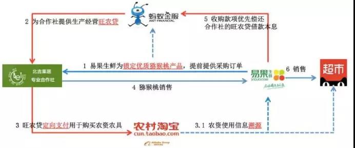 例如:天貓超市的供貨電商易果生鮮與陜西周至縣北吉果蔬專業(yè)合作社簽訂采購協(xié)議。螞蟻金服基于采購訂單,在對訂單進行識別并確認后,由網(wǎng)商銀行為合作社數(shù)百名果農(nóng)社員提供低息貸款,果農(nóng)拿到這筆貸款后,通過定向支付工具專項用于從農(nóng)村淘寶購買指定的農(nóng)藥、農(nóng)資、農(nóng)具。最后果品通過易果生鮮進駐天貓超市進行銷售。這種基于產(chǎn)業(yè)鏈形成的閉環(huán)信貸模式,突破了商業(yè)銀行傳統(tǒng)的評級授信要求,也無須另行提供抵押、質(zhì)押、擔保,提供的資金效率高、環(huán)節(jié)更簡單,利率則遠低于民間借貸。