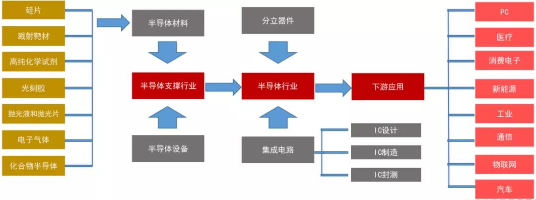半導體行業(yè)具有技術難度高、投資規(guī)模大、產(chǎn)業(yè)鏈環(huán)節(jié)長、產(chǎn)品種類多、更新迭代快、下游應用廣泛的特點,產(chǎn)業(yè)鏈呈垂直化分工格局。半導體制造產(chǎn)業(yè)鏈包含設計、制造和封裝測試環(huán)節(jié),半導體材料和設備屬于芯片制造、封測的支撐性行業(yè),位于產(chǎn)業(yè)鏈最上游。