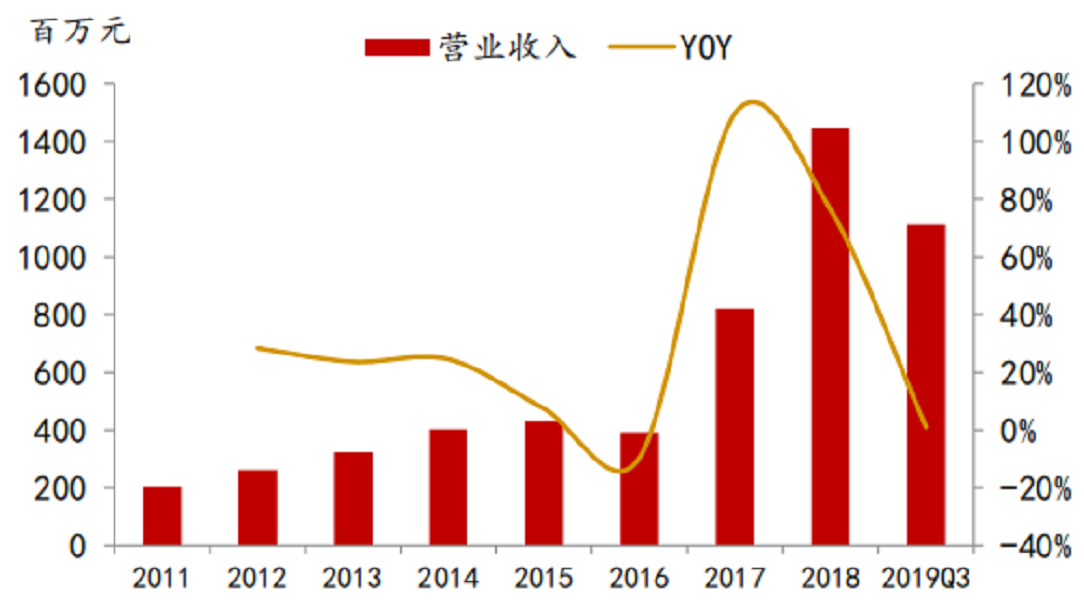 2018年,公司實(shí)現(xiàn)營(yíng)業(yè)收入14.46億元,同比增長(zhǎng)76.23%,實(shí)現(xiàn)歸母凈利潤(rùn)2.84億元,同比增長(zhǎng)239.37%。其中電子化學(xué)品占公司總營(yíng)收的64.9%,是公司最主要的收入來源。