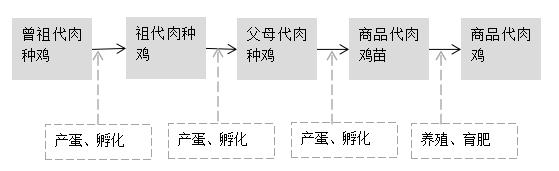 我國白羽肉雞祖代種雞養(yǎng)殖企業(yè)主要從國外引進祖代肉種雞苗,繁育父母代肉種雞苗出售給父母代肉種雞養(yǎng)殖企業(yè),父母代肉種雞產蛋孵化出商品代雛雞銷售給代養(yǎng)戶,商品代肉雞經屠宰加工后成為雞肉產品。白羽肉雞的目標客戶主要是肯德基、麥當勞等快餐消費及分割產品出口。