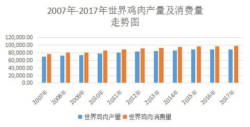 近年來,雞肉產量、銷量呈快速上升趨勢。根據wind統(tǒng)計數據,世界雞肉生產量保持穩(wěn)定增長,從2007年的69447千噸,增長到2017年6月的89470千噸,世界雞肉消費量從2007年的76487千噸,增長到2017年6月的98771千噸。