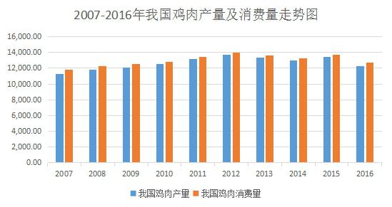 從2007年開始,受H7N9疫情和成本快速上升等因素的困擾,中國雞肉生產進入了平穩(wěn)發(fā)展時期,雖然增長速度有所減緩,但是增長趨勢依然強勁。2007年至2012年,我國雞肉年產量及消費量持續(xù)增長,2013年以來受疫情、中央八項規(guī)定等因素的影響,雞肉年產銷量略有下降,但始終保持在1,300萬噸以上的水平。雞肉產量從2007年的11291千噸增長至2016年的12300千噸,雞肉消費量從2007年的11773千噸增長至2016年的12730千噸。