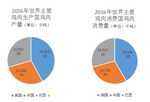 從地區(qū)分布上看,世界前三大雞肉生產和消費國家為美國、中國和巴西。美國為世界雞肉第一大生產國。根據wind數據統(tǒng)計,2016年,美國雞肉生產量達18261千噸;中國雞肉生產量達12300千噸;巴西雞肉生產量達12910千噸。2016年,美國、中國和巴西的雞肉消費量分別為18346千噸、12730千噸和12913千噸。