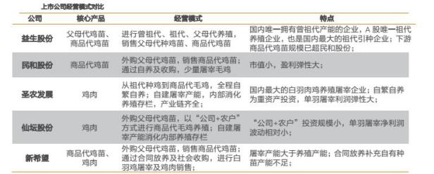 從2010年益生股份上市之后,A股就已經有了完整了白羽肉雞產業(yè)鏈。目前共有5家上市公司——民和股份、益生股份、圣農發(fā)展、仙壇股份、新希望——擁有相關業(yè)務。各家的側重點略有不同。