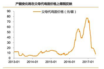 目前,在產父母代存欄自4月初開始回落,預示著6中旬之后,毛雞價格將繼續(xù)保持上漲趨勢。但是,從在產父母代存欄的絕對量規(guī)模來看,2016年3月毛雞價格上漲時,對應于2015年底2016年初的在產父母代存欄約1050-1200萬套。所以,雖然在產父母代存欄已經下降了超20%,但是絕對規(guī)模1295萬套(截止至2017年第25周)還是在歷史相對高位,這也就意味著產能還未能徹底出清。那么,當前在產父母代存欄規(guī)模只能支撐價格從底部反彈,從深度虧損區(qū)間向盈虧平衡甚至略有盈利演變,還不能支撐雞價進入暴利區(qū)間。只有在產父母代存欄進一步下降,產業(yè)價格才能有更高的空間。