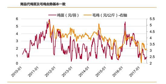 理論上,在產父母代存欄的變動,3周后將傳導到雞苗環(huán)節(jié)。但實際上,由于商品代離消費者最近,需求端的影響要大于供給端的影響。從數據上看,雖然商品代雞苗由于沒有庫存,產品價格波動幅度遠大于毛雞價格的波動幅度,但是兩者之間的走勢卻基本一致,間隔最多不會超過1周。因此,判斷毛雞價格走勢基本等價于判斷雞苗價格。
