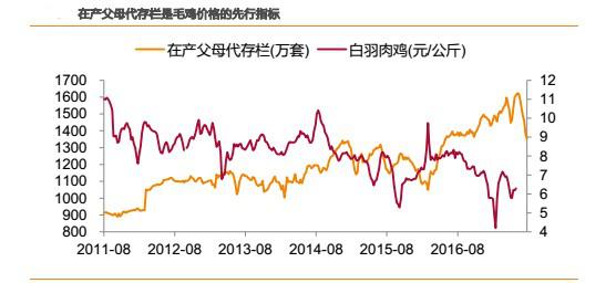 在產父母代存欄是商品代的直接產能,代表了中短期的供給能力。理論上,經過3周孵化期+6 周育肥期后毛雞出欄,則在產父母代存欄是毛雞價格提前9-10周的先行指標,與毛雞價格走勢呈反相關。從實際運行來看,理論上走勢與實際走勢大體吻合。因此,在產父母代存欄是相對于毛雞價格提前兩個多月的先行指標。