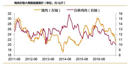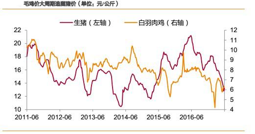 2)短周期內,受各自供求關系決定產品價格,則豬價、雞價走勢有可能會發(fā)生背離,但背離時間一般不會超過1個季度,且背離的時間一般出現在春節(jié)后的上半年。如2012年2月-4月,2014年2月-4月、2015 年3月-6月、2016年3月-6月、2017年2月-3月。