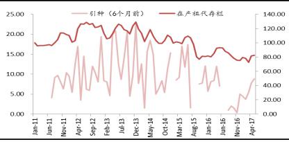 祖代在產存欄量逐漸進入淘汰期。分析祖代在產存欄量主要與引種量相關,一般而言,引種6個月以后逐步進入產蛋期,所以我們將6個月前的引種量與當前的在產祖代存欄量分析后對比這兩者相關性較強。比較典型的如14年12月份的引種高點對應了15年6月份的在產祖代存欄量處于階段性高位,但由于15年一季度引種空缺,所以在產祖代存欄量隨后數個月均處于下降趨勢之中,引種下降導致在產祖代存欄下降非常明顯。