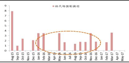 先看祖代存欄情況,我們對于引種量與存欄量之間做出三種情形分析:1)正常的產蛋周期,基本上從引種到淘汰約15個月,則16年3月份開始的引種逐漸進入淘汰期;2)淡季換羽,即在換羽時的雞價一般,通常在50周左右換羽,最終淘汰約在18個月,因此15年12月份開始的引種逐步進入淘汰期;3)旺季換羽,即在換羽時雞價較高,通常在第一產蛋周期結束后才做換羽,最終淘汰約在21個月,所以15年9月份開始的引種逐步進入淘汰期。