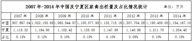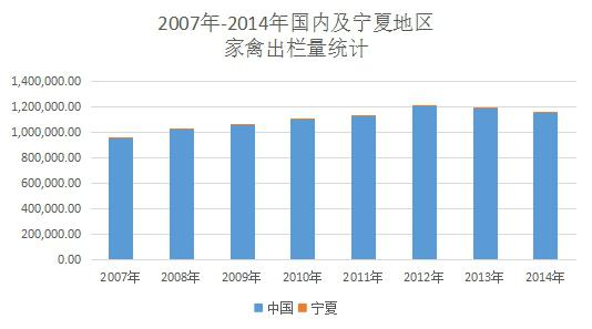 依據wind數據,2014年全國家禽出欄量1154167.1萬只,寧夏地區(qū)家禽出欄量達1204.4萬只,占全國出欄量的0.1%。自2007年以來,寧夏地區(qū)的家禽出欄量一直以0.1%~0.12%的全國占比,市場占比非常小。