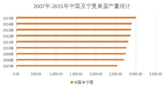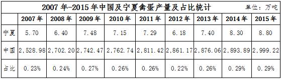 寧夏不僅是在出欄量上所占比重較低,在產量上也并不樂觀。2015年底,中國總體禽蛋產量為2999.22萬噸,而寧夏僅8.8萬噸,占全國的0.29%。2007年以來,寧夏禽蛋產量占比在0.23%~0.29%之間,2014年占比達到最高。