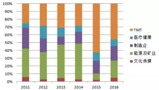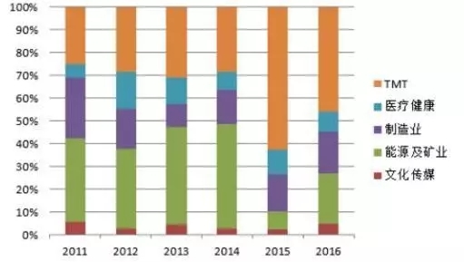 在國(guó)內(nèi) PE 投資方面,2016年TMT 行業(yè)投資熱度有所降低,但這與 2016 年市場(chǎng)整體投資節(jié)奏放緩有一定關(guān)系。如果從投資 的行業(yè)占比來看,TMT 和制造業(yè)仍然是最受投資機(jī)構(gòu)追捧的領(lǐng)域。