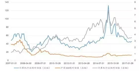 2007年至今計(jì)算機(jī)行業(yè)及滬深300股票絕對(duì)估值及計(jì)算機(jī)行業(yè)相對(duì)估值情況