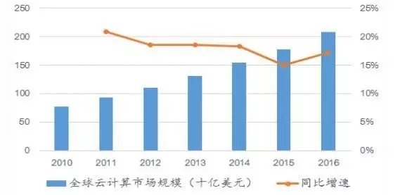 2016 年全球云計(jì)算市場(chǎng)規(guī)模達(dá)到 2086 億美元,同比增長(zhǎng) 17.19%;從 2010 年至 2016 年,全球云計(jì)算的年 均復(fù)合增速達(dá)到 18.08%。而國(guó)內(nèi)云服務(wù)市場(chǎng)規(guī)模從 2010 年至 2015 年年均復(fù)合增速為 64.74%,領(lǐng)先全球增速。