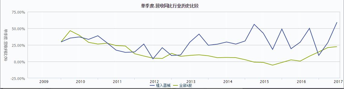 根據(jù)與全部A股營收相比較,在2012年之前,植入器械的營收總體上與全部A股的保持一致。2012年之后,全部A股的營收變動相對平緩;而植入器械行業(yè)營收基本高于全部A股營收,在2016年經(jīng)歷谷值之后,行業(yè)保持增長的趨勢。