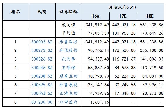 通過對植入器械上市公司的盈利做出預(yù)測,上市公司總收入的平均值在2017年、2018年預(yù)計分別是130,963.28萬元、173,645.26萬元,相對于2016年的77,051.30萬元,呈現(xiàn)逐年增長的趨勢;其上市公司盈利最高值預(yù)測值在2017年、2018年分別達到442,021.18萬元、561,338.86,相較于2016年的341,912.49萬元,呈現(xiàn)逐年增長的趨勢,市場總體看好植入器械上市公司。