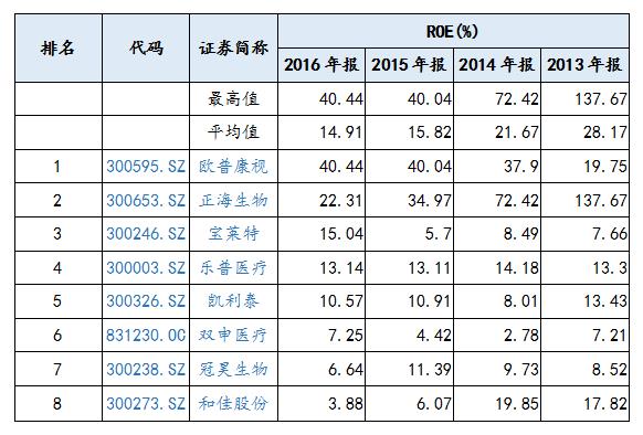 根據(jù)植入器械行業(yè)上市公司年報數(shù)據(jù)顯示,上市公司凈資產(chǎn)收益率平均值在2013年至2016年分別為28.17%、21.67%、15.82%、14.91%,凈資產(chǎn)收益率最高值在2013年至2016年分別為137.67%、72.42%、40.04%、40.44%。