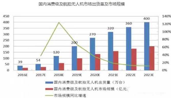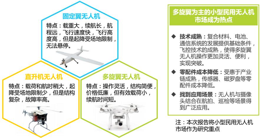 隨著技術成熟,零配件成本降低,并且開發(fā)了航拍、電力巡檢等應用場景,以多旋翼無人機為主的小型民用無人機市場成為熱點。