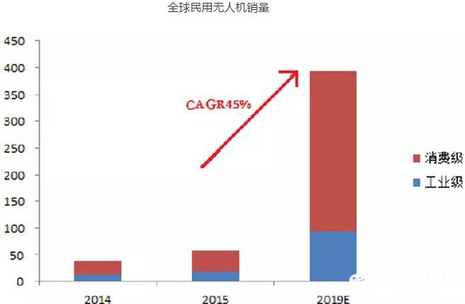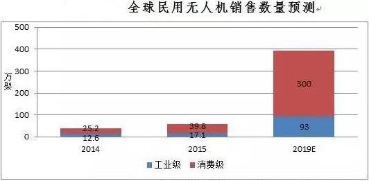 全球民用無人機在2014年迎來大約37.8萬架的銷量,其中工業(yè)級無人機銷量約12.6萬架,消費級無人機銷量約25.2萬架。在2015年大約銷售民用無人機56.9萬架,其中,工業(yè)級無人機銷量約17.1萬架,消費級無人機銷量約39.8萬架。IDC預測,到2019年全球無人機年銷量將達到393萬架,其中消費級300萬臺,CAGR達到60%;工業(yè)級無人機銷量為93萬臺,CAGR達到45%。