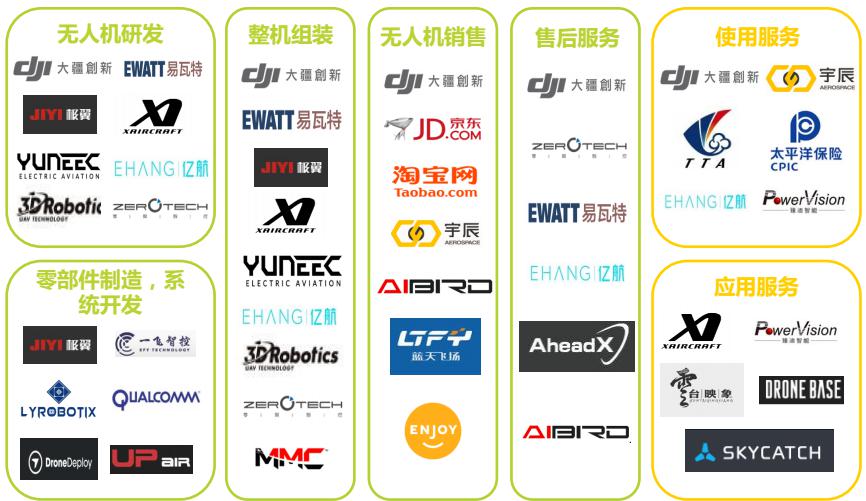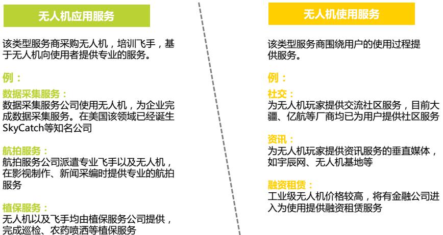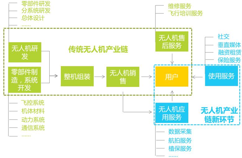 無人機產(chǎn)業(yè)鏈除了傳統(tǒng)的生產(chǎn)制造環(huán)節(jié)外,還出現(xiàn)了針對用戶使用過程的社交、保險以及數(shù)據(jù)采集、航拍等基于應用場景的產(chǎn)業(yè)服務。