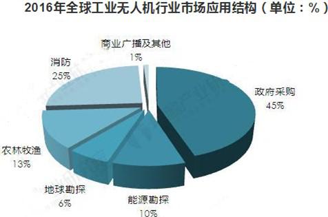 從應用結構來看,當前全球工業(yè)無人機行業(yè)中45%為政府采購,能源勘探和地球勘探的應用占比分別為10%和6%,農(nóng)林牧漁的應用占比約為13%,在消防領域的應用占比達到25%。