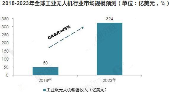 隨著工業(yè)級無人機技術的不斷發(fā)展,未來工業(yè)級無人機將呈爆發(fā)式增長。結合國際權威機構對未來工業(yè)級無人機行業(yè)發(fā)展趨勢的判斷,預計到2023年,全球工業(yè)級無人機市場規(guī)模將超過300億美元。2018-2023年行業(yè)年均復合增長率將維持在45%左右。