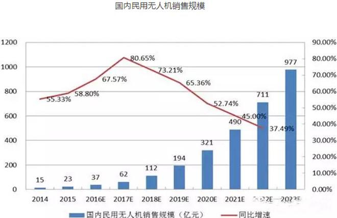 2014年國內民用無人機產(chǎn)品銷售規(guī)模15億元,2015年銷售規(guī)模23.3億元,同比增長55.3%。據(jù)IDC數(shù)據(jù)預測,2019年中國民用無人機市場銷售規(guī)模達到390萬臺,合計約600億元。預計到2023年,國內民用無人機市場規(guī)模將會達到976.9億元,年復合增長率59%。
