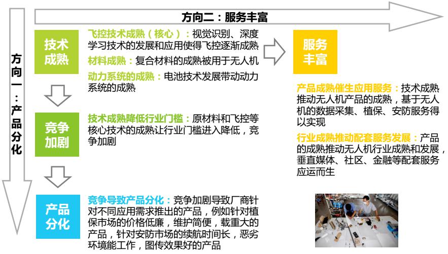 無人機技術成熟降低了行業(yè)門檻,使得行業(yè)競爭加劇,產(chǎn)品出現(xiàn)分化,技術和產(chǎn)品的成熟也使得應用和配套服務越發(fā)豐富。