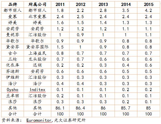 內(nèi)衣作為消費者的第二層“肌膚”,消費者對內(nèi)衣的消費比其他成衣具備更強的忠誠度,進入 21 世紀(jì)后,消費者對內(nèi)衣品牌的認(rèn)可也越來越強。 雖然部分品牌由于品牌老化導(dǎo)致市占率降低,但是總體看,前 16 家女士內(nèi)衣品牌的市場份額從 2011 年的 13.9%提升到了 2015 年的 15%。前八大男士內(nèi)衣品牌的市占率從 5.4%提升到 6%。