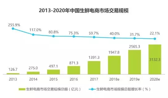 2017年中國生鮮電商市場交易規(guī)模約為1391.3億元,同比增長59.7%,預(yù)計2020年,生鮮電商交易規(guī)??梢赃_(dá)到3132億元。一方面基于消 費者消費習(xí)慣養(yǎng)成,另一方面基于冷鏈和倉儲系統(tǒng)迅速完善。