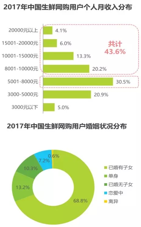 從用戶屬性來看,體驗過創(chuàng)新模式的用戶中高學(xué)歷、高家庭月收入的人群占比均高于整體生鮮網(wǎng)購用戶,與創(chuàng)新模式中高端消費者的定位相吻合。體驗過創(chuàng)新模式的用戶中78.2%擁有大學(xué)本科及以上學(xué)歷,80.7%的用戶家庭月收入在10000元以上,其中家庭月收入在10001-15000元的用戶最多,占比達(dá)28.2%。