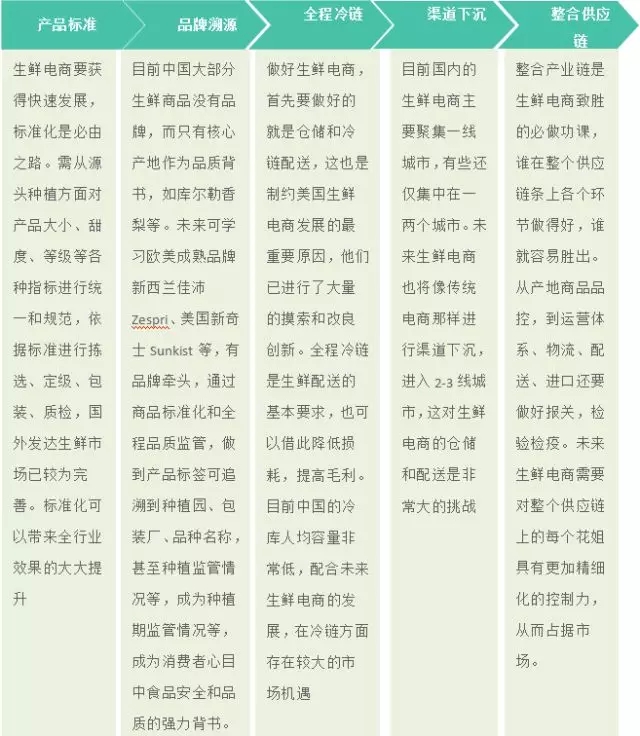 線上線下融合成生鮮電商發(fā)展重要趨勢;圍繞零售核心,優(yōu)勢痛點互補;各種渠道的融合是發(fā)展的必然趨勢。