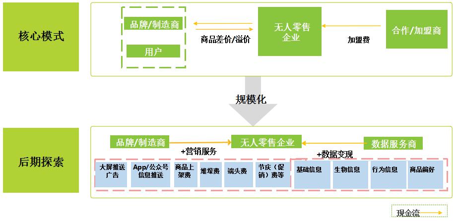 無人零售企業(yè)收入來源以銷售商品賺取差價(jià)為主,并且通過規(guī)?;岣咦h價(jià)能力降低采購成本。此外,從加盟商獲取加盟費(fèi)用的商業(yè)模式也已經(jīng)開始推行。無人零售發(fā)展至中后期,企業(yè)數(shù)據(jù)更為龐大,其盈利模式將隨之產(chǎn)生更多的想象空間,以互聯(lián)網(wǎng)思路開展?fàn)I銷服務(wù)、數(shù)據(jù)變現(xiàn)等都是比較成熟的可參考模式。
