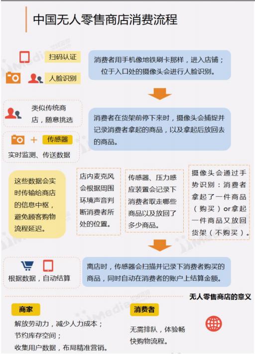 國內(nèi)目前的無人零售店的消費(fèi)流程主要分為:掃碼認(rèn)證或人臉識別、挑選商品、根據(jù)數(shù)據(jù)自動結(jié)算這些環(huán)節(jié)。對于商家而言,可以節(jié)約人力成本和沉淀消費(fèi)數(shù)據(jù),對于消費(fèi)者而言,則可以增強(qiáng)體驗(yàn)感和減少排隊(duì)時(shí)間。