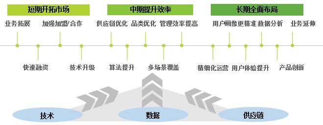 中期:企業(yè)的運(yùn)營重點(diǎn)在于供應(yīng)鏈與管理效率的提升,包括企業(yè)進(jìn)行技術(shù)算法提升,并將供應(yīng)鏈進(jìn)行網(wǎng)狀轉(zhuǎn)變,同時(shí)擴(kuò)充或開發(fā)零售多場景,覆蓋主要消費(fèi)場景,品類、商品組合進(jìn)入精選模式,根據(jù)不同用戶個(gè)性化/精準(zhǔn)化推送等。