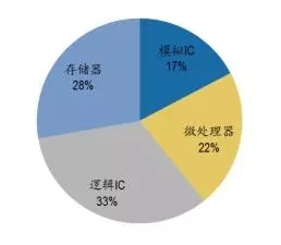 從進口集成電路產(chǎn)品的類別來看,微處理器/控制器進口額位列榜首,2014年價值高達1052.2億美元,占比48.33%;接著是半導體存儲器,2014年價值達542.8億美元,占比24.93%,之后是放大器,占比4.13%。