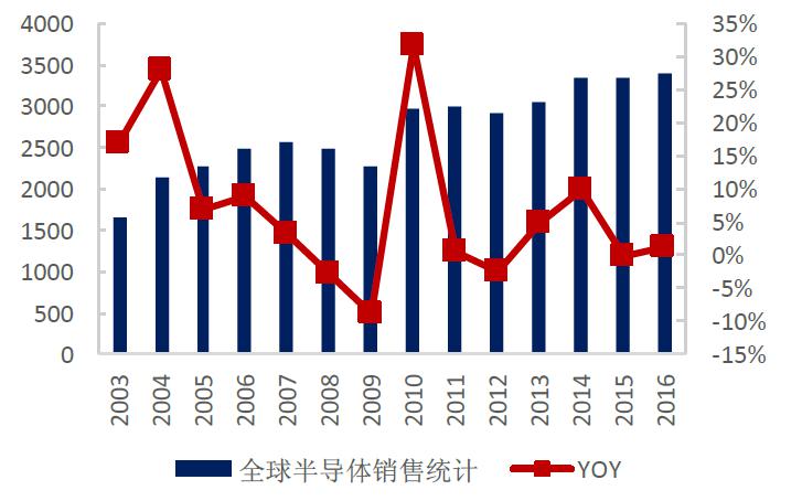 隨著全球經(jīng)濟的逐步復蘇,PC、手機、液晶電視等消費類電子產(chǎn)品需求不斷增加,同時在以物聯(lián)網(wǎng)、可穿戴設備、云計算、大數(shù)據(jù)、新能源、醫(yī)療電子和安防電子等為主的新興應用領域強勁需求的帶動下,半導體銷售市場規(guī)模穩(wěn)定增長,預計2017年全球集成電路市場規(guī)模增長至3465億美元。