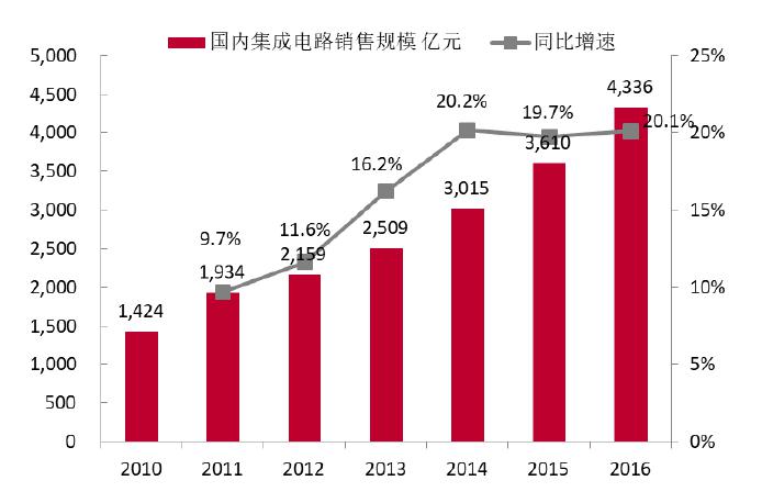 2016年中國集成電路產(chǎn)業(yè)繼續(xù)高速增長的勢頭,從半導體行業(yè)協(xié)會的2017年最新統(tǒng)計,2016年中國集成電路產(chǎn)業(yè)銷售額高達4335.5億元,比2015年增長20.1%。