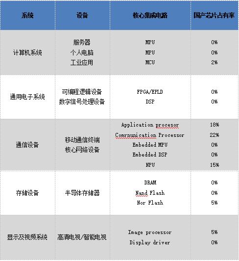 表中計算機系統(tǒng)中的MPU、通用電子系統(tǒng)中的FPGA/EPLD和DSP、通信裝備中的 Embedded mpu和DSP、存儲設備中的DRAM和 Nand flash、顯示及視頻系統(tǒng)中的 Display driver,國產(chǎn)芯片占有率都是零這就指出了一個嚴峻的問題,我國所需核心芯片主要依賴進口。半導體產(chǎn)業(yè)關系國家經(jīng)濟和安全命脈,中國半導體從業(yè)者身肩重責,必須為核心芯片國產(chǎn)化不斷努力。