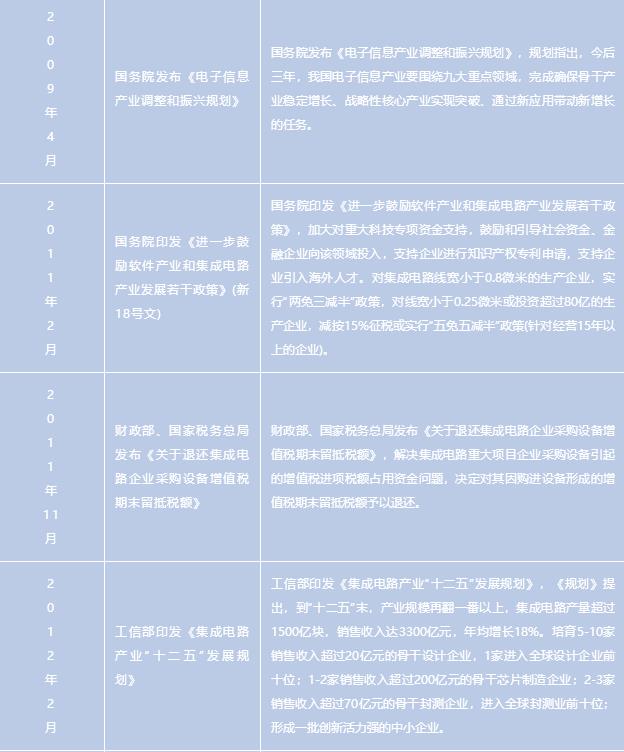 2011年出臺的《國務院關于印發(fā)進一步鼓勵軟件產(chǎn)業(yè)和集成電路產(chǎn)業(yè)發(fā)展若干政策的通知》,提出要大力支持軟件和集成電路重大關鍵技術(shù)的研發(fā),努力實現(xiàn)關鍵技術(shù)的整體突破,加快具有自主知識產(chǎn)權(quán)技術(shù)的產(chǎn)業(yè)化和推廣應用,重點支持高端芯片、集成電路裝備和工藝技術(shù)、集成電路關鍵材料、關鍵應用系統(tǒng)的研發(fā)以及重要技術(shù)標準的制訂;在《電子信息制造業(yè)“十二五”發(fā)展規(guī)劃》和《集成電路產(chǎn)業(yè)“十二五”發(fā)展規(guī)劃》中也均提出要著力發(fā)展芯片設計業(yè),壯大芯片制造業(yè),開發(fā)髙性能集成電路產(chǎn)品,增強先進和特色工藝能力。