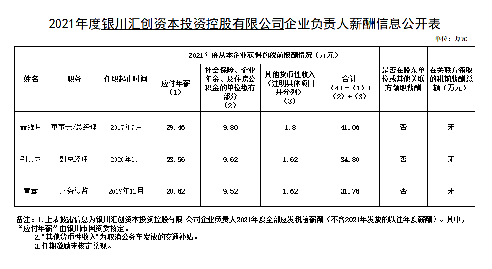 銀川匯創(chuàng)資本投資控股有限公司企業(yè)負責人2021年度薪酬情況